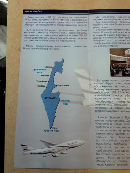 An El Al brochure distributed to tourists features a map of Israel inside its 1948 armistice borders. The brochure is distributed to tourists from Russia, and shows the areas of Judea, Samaria, and the Golan, liberated in the 1967 Six-Day War, as outside the borders of the country.