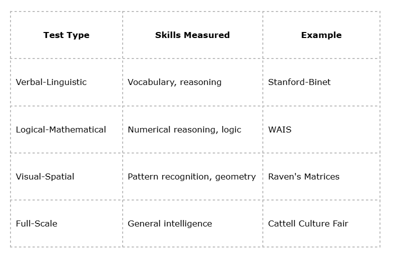 - Logical-Mathematical tests: Focus on problem-solving and numerical reasoning.