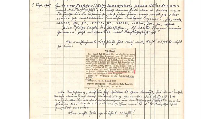 Darmstadt, August 24, 1942. Secret State Police – State Police Post, Darmstadt Signed by proxy: Fentz.)