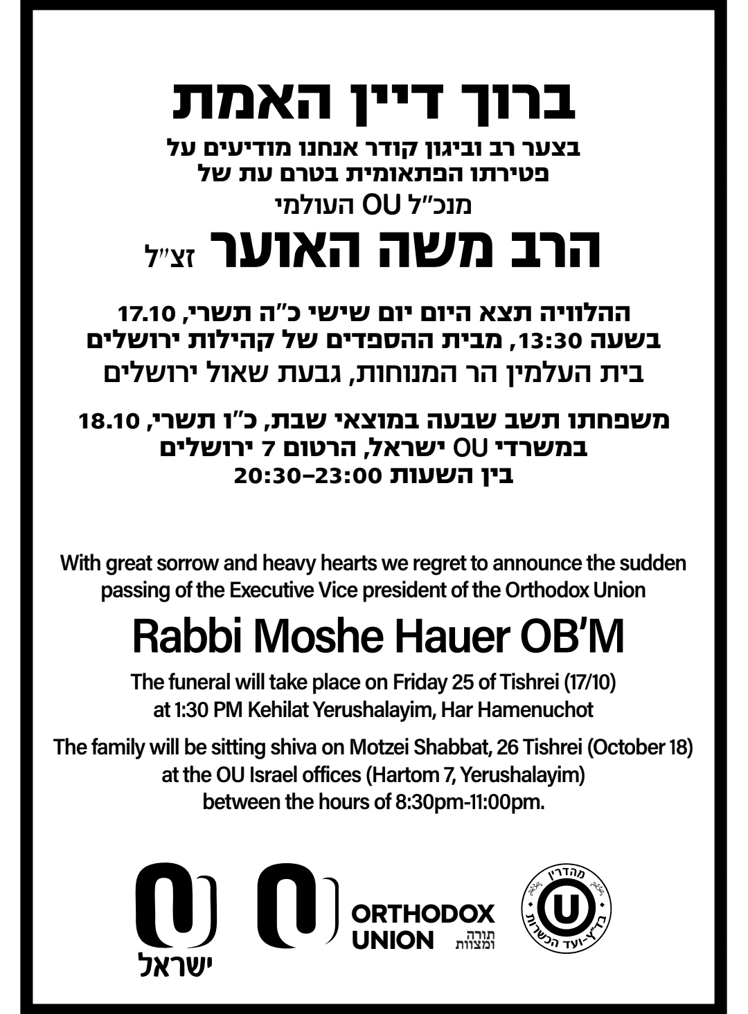 The funeral for Executive Vice President of the Orthodox Union, Rabbi Moshe Hauer, will take place on Friday, 25 of Tishrei (17/10) at 1:30 PM at Kehilat Yerushalayim, Har Hamenuchot