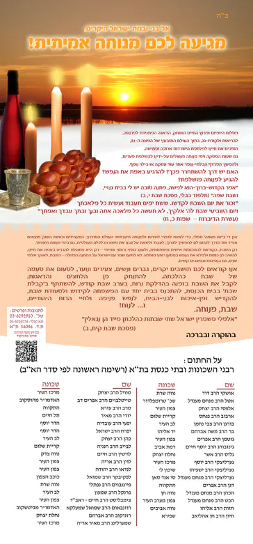 A special brochure signed by the rabbis of Tel Aviv will be sent out to every resident of Tel Aviv explaining how Shabbat is a powerful tool for creating a harmonious, peaceful home and raising great children, good health and prosperity.