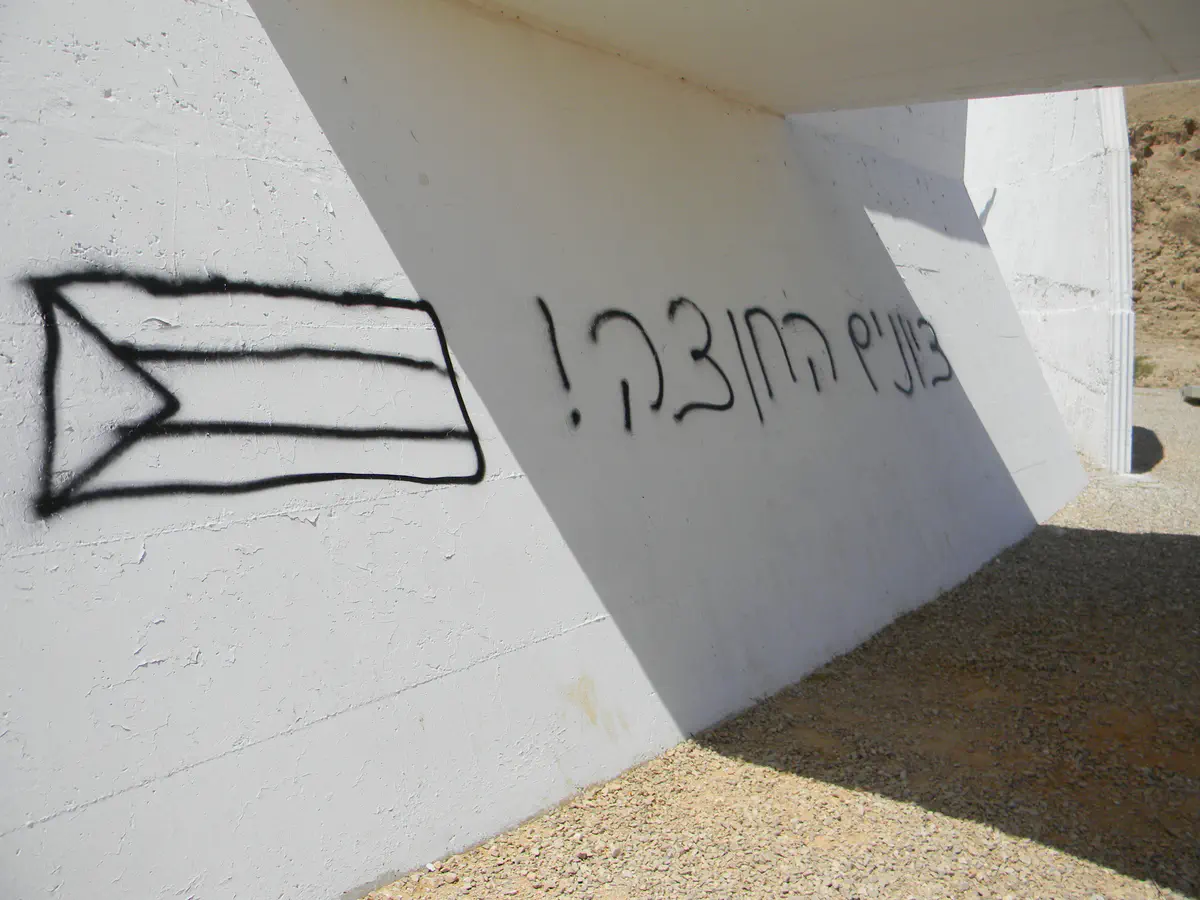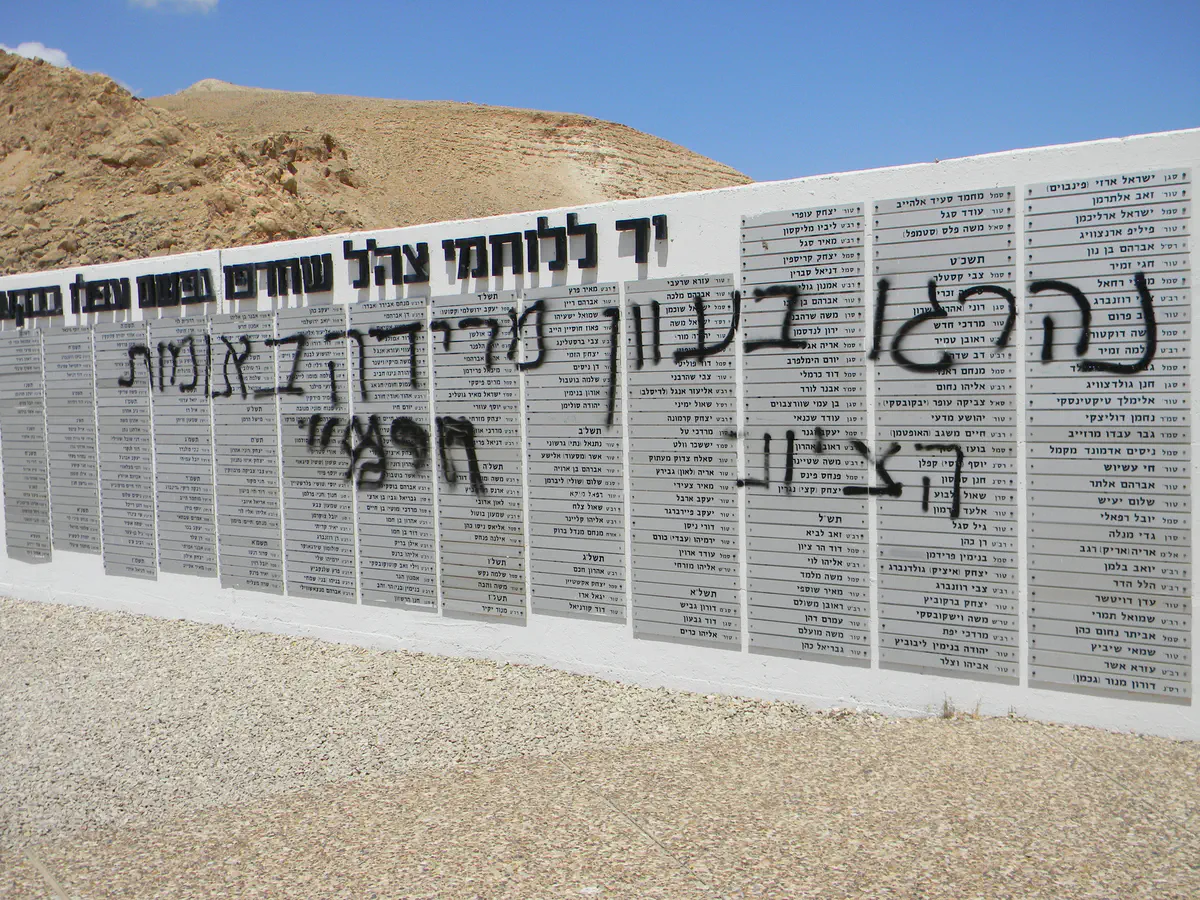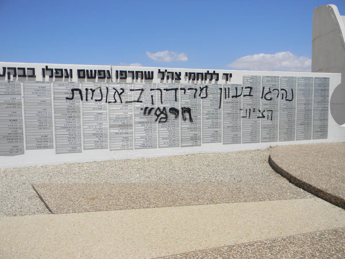 The monuments, dedicated to Israel's fallen, were spray painted with swastikas, Palestinian Authority flags, and anti-Israel slogans in Hebrew.