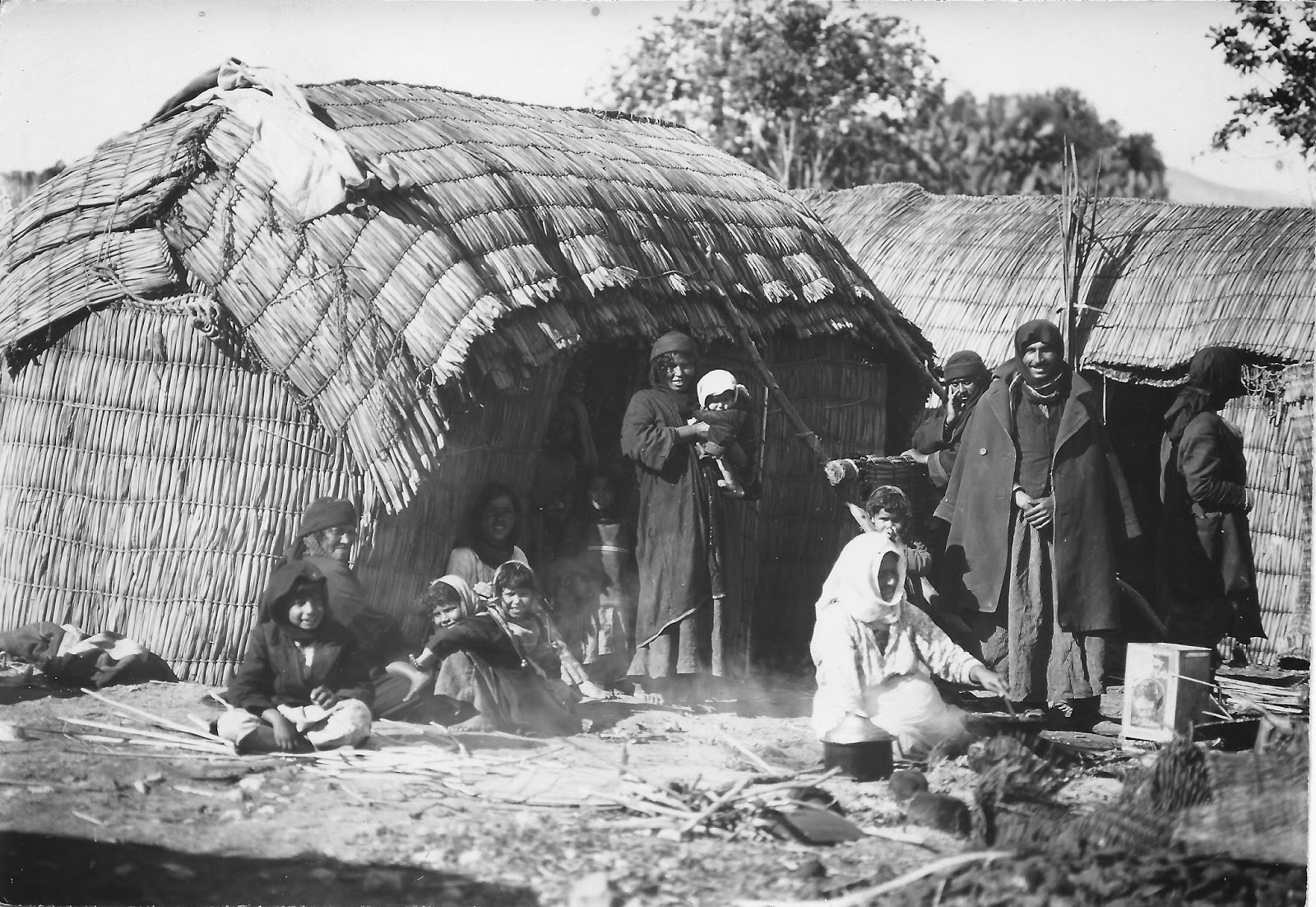 | Bedouin Arab family near Lake Hula and their reed huts |