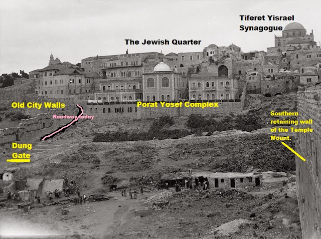 The original caption read: "Clearing of lower end of Tyropean Valley, near Dung Gate (1935)." The photo shows the Jewish Quarter of Jerusalem's Old City before its destruction in 1948. The Porat Yosef Yeshiva is in the center of the picture with the white dome. Today this area is the entrance way to the Western Wall plaza. (Library of Congress, circa 1935, captions added by Israel Daily Picture)