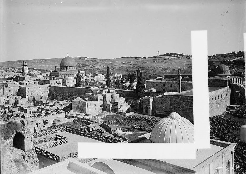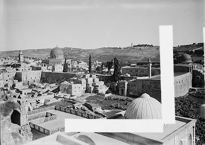 A puzzling picture from the Library of Congress collection showing the "Temple area. Jerusalem. The Dome of the Rock and the western Temple wall." Presumably the wide white lines are photographic editor's tape. At the corner made by the tape is the Porat Yosef dome. The Library of Congress dates the picture "between 1898 and 1946," but Porat Yosef was not built until 1923. 1946 is the year the American Colony Photographic Department closed.