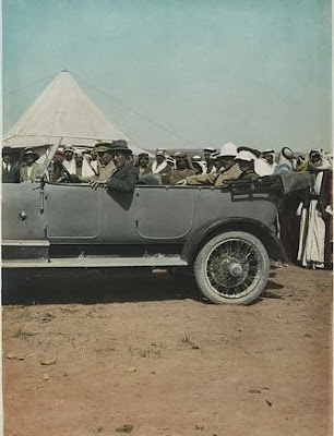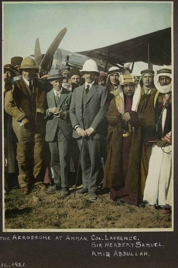 According to the Library of Congress' description of the hand-colored picture below, "The photographs show meetings between Arab, Bedouin, and British officials around April 17-27, 1921, at Amir Abdullah ibn Hussein's camp at Amman, Jordan. During these meetings British High Commissioner Herbert Samuel proclaimed Amir Abdullah as the ruler of Transjordan, under British protection."