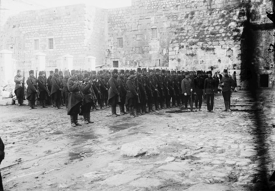Turkish soldiers drilling in the square outside of the Church of the Nativity in Bethlehem (circa 1900)