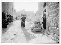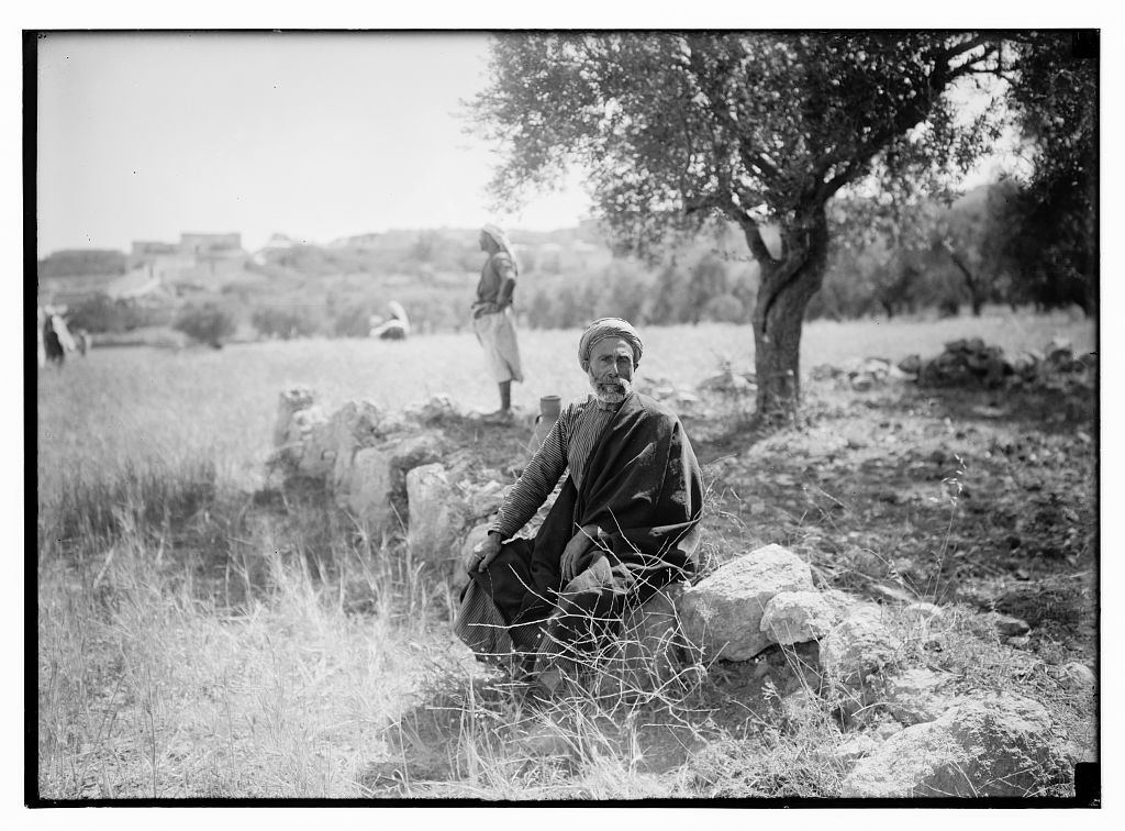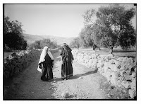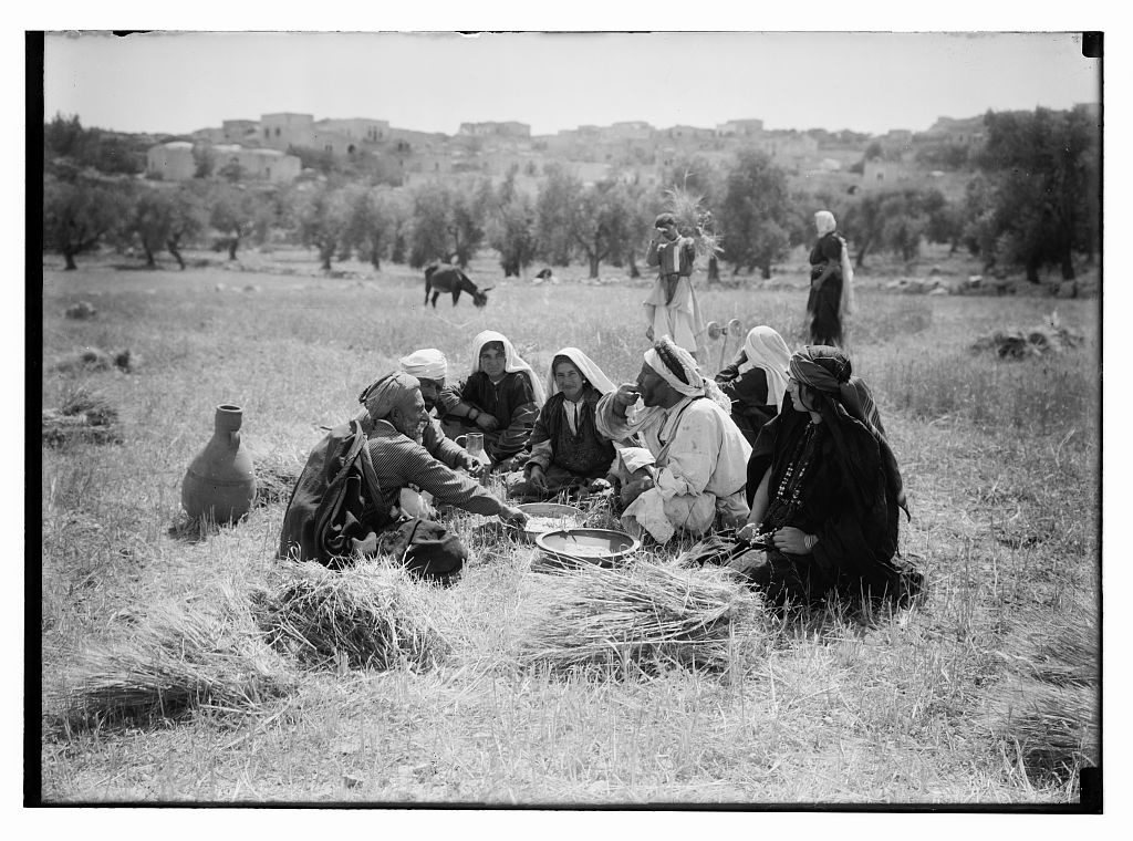 A major effort was made by the American Colony photographers to re-enact the story of Ruth, probably in the fields near Bethlehem. "Ruth," we believe, was a young member of the American Colony community; the remaining "cast" were villagers from the Bethlehem area who were actually harvesting, threshing and winnowing their crops.