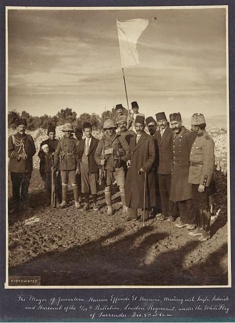 Handwritten caption: "The Mayor of Jerusalem Hussein Effendi El Husseini meeting with Srgts Sedwick and Hurcomb..., London Regiment, under the White Flag of Surrender, December 9th at 8 a.m." (1917, Library of Congress)