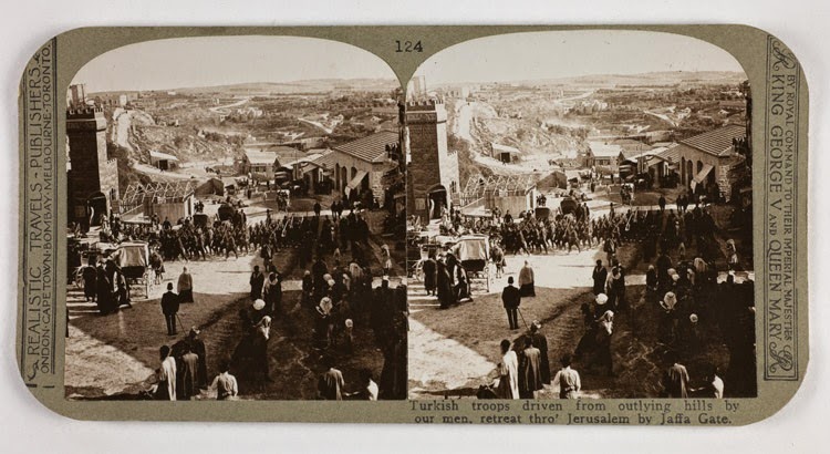 Turkish troops arriving in Jerusalem from nearby positions, before fleeing the city (1917, stereograph photo, Monash University archives)