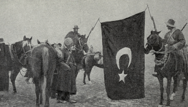 The latest batch of photographs released this week by the Ottoman Imperial Archives includes several treasures showing historical sites and events in Palestine. The picture below shows two cavalrymen from the British forces hoisting a Turkish flag on their bayonets.