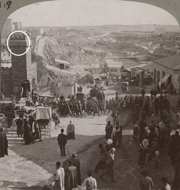 But the photo was not very clear. The Ottoman Archives photo below is so clear that viewers can see the writing on the building on the left, "Bezalel" in Hebrew and English. The Bezalel pavilion was built outside of the Jaffa Gate in 1912 to sell souvenirs and crafts made at the Bezalel Academy of Arts. The structure was demolished in 1918 by the British.
