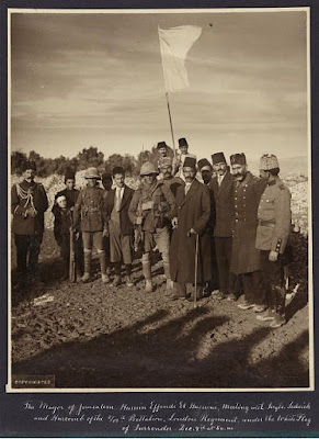 The LOC picture of two British sergeants accepting the surrender flag from Jerusalem officials (not Turkish officers) is one of the most iconic photographs of World War I in Palestine. The picture was taken by a photographer from the American Colony Photo Department; the flag was a sheet taken from an American Colony bed.