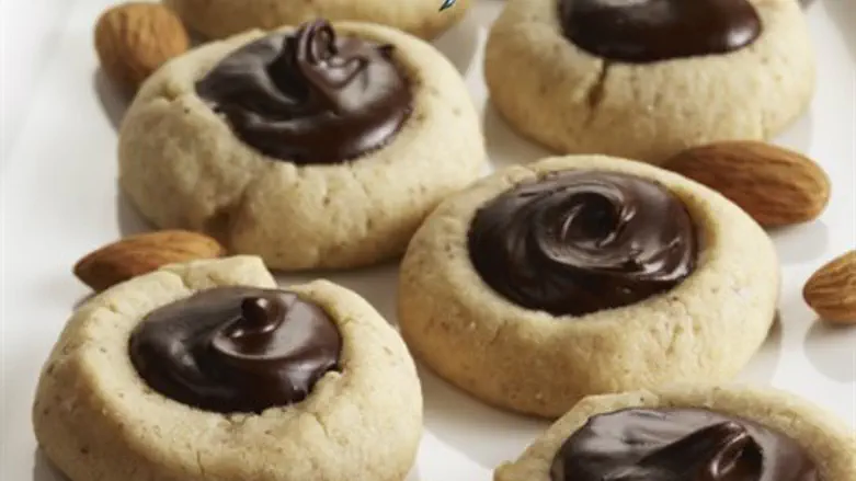 6)Place the chocolate and butter into a microwave-safe bowl. Microwave on high power, using 20 second intervals, stirring in between each interval until completely melted. Using a spoon, fill the cookie indentations. Allow to harden slightly. Store the cookies in the refrigerator but serve at room temperature.