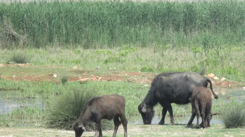 The next morning, after breakfast, we drove back down the Naftali Ridge and into the heart of the Hula Valley, to the famous Hula Valley Nature Reserve and Lake, where twice a year tens of thousands of migrating birds stop over on their way to Africa or back to Europe. Although it was after the winter/spring “green” season and the springtime bird migration season, we nonetheless were deeply impressed by the beauty and the “green” of this nature reserve and the abundance of wildlife in the reserve. The walking path that meanders through the nature reserve starts out as a well-kept asphalt path running alongside the Hula Lake taking us past ducks, geese and a herd of water buffalo (giving us an authentic feeling of really being on an African safari) until we came to an astounding board walkway a mere ½ meter (1 ½ feet) above the Hula Lake.