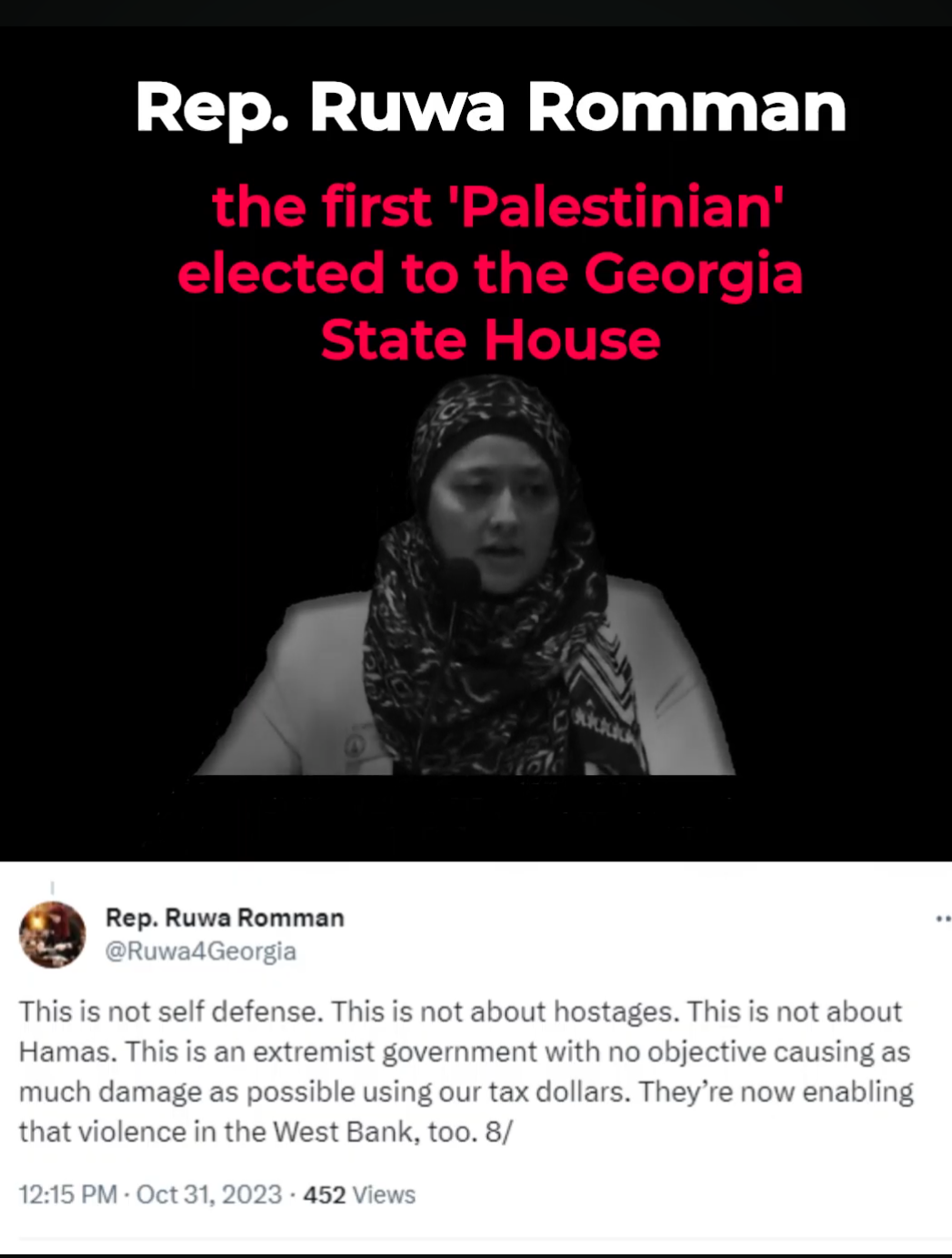 In Georgia, Rep. Ruwa Romman, a former communications director for CAIR, and the first Muslim ‘Palestinian’ in the George State House, described the Oct 7 attacks as an “escalation” caused by “settler violence and terror aimed at Palestinian business owners”
