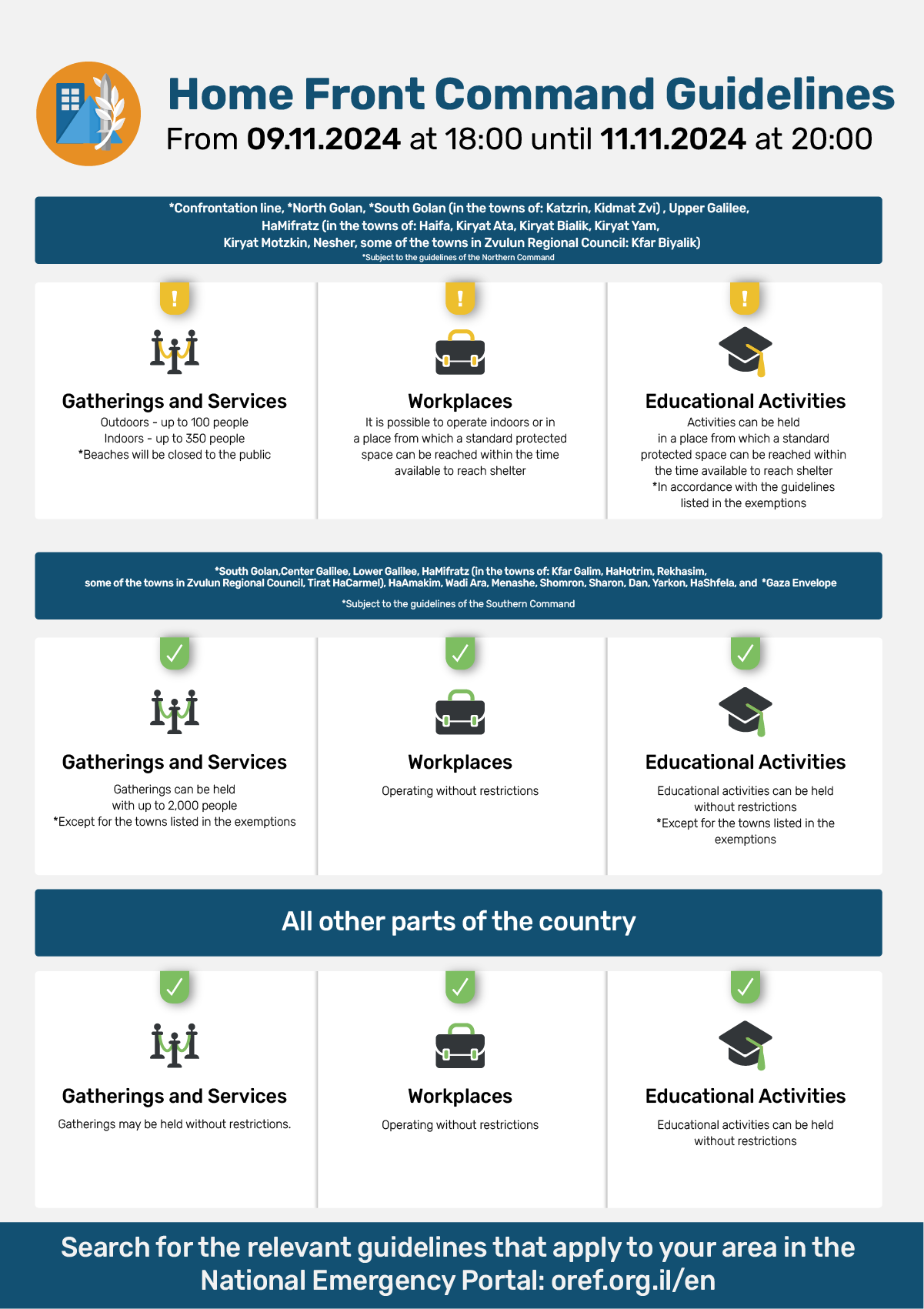 8:00 p.m.: Following a situational assessment, it was determined that as of Monday at 8:00 p.m., changes will be made to the Home Front Command’s defensive guidelines.