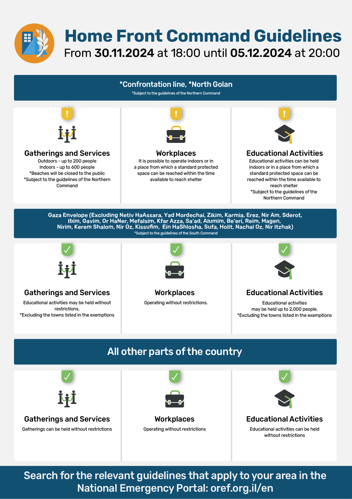 The IDF added, "Guidelines published on the official Home Front Command channels must be followed by the public. Full guidelines are updated on the National Emergency Portal and the Home Front Command app."
