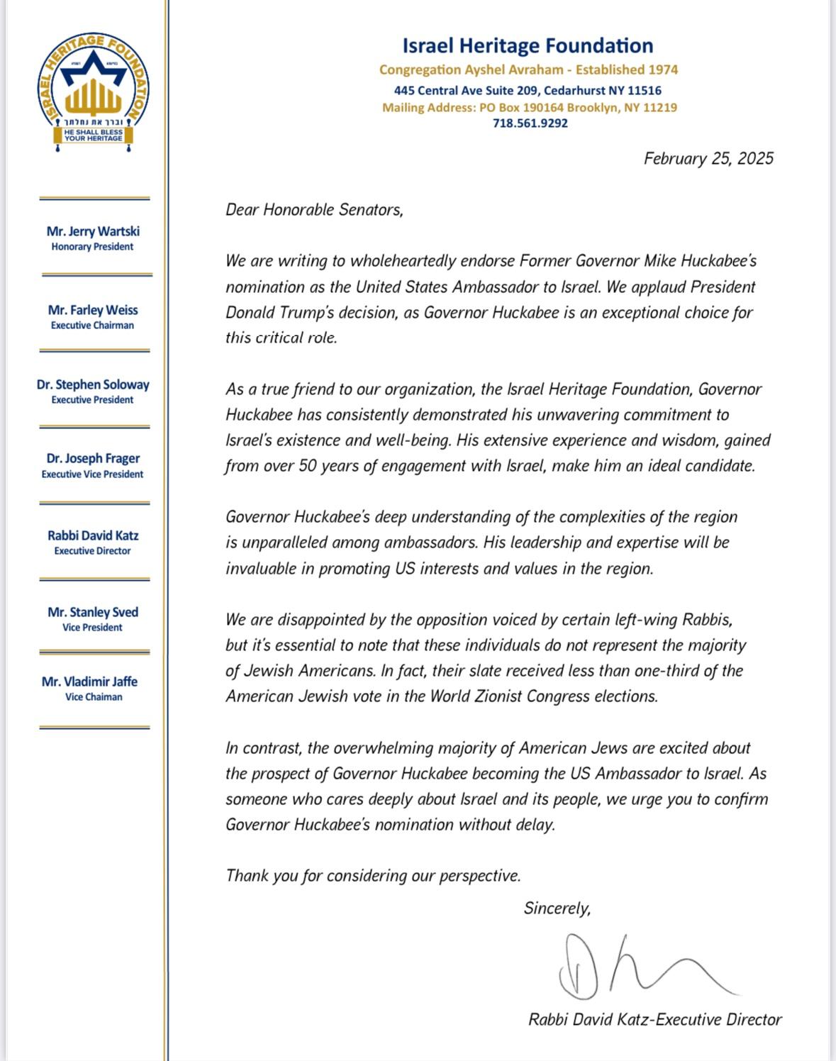 Rabbi Katz and the Israel Heritage Foundation urged the Senate to confirm Huckabee’s nomination without delay, underscoring his strong ties to Israel and his deep-rooted commitment to the US-Israel alliance.