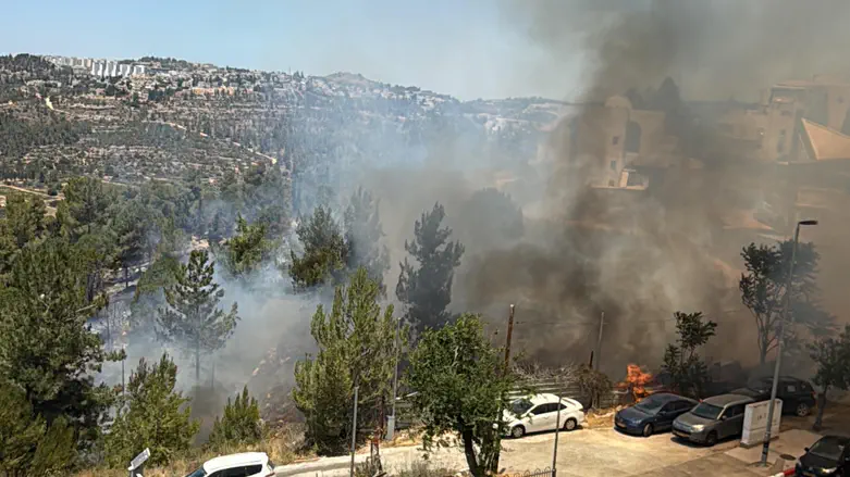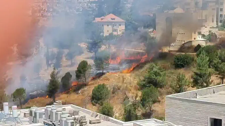 A police statement read: "Following a fire that broke out near the Har Nof neighborhood in Jerusalem, officers from the Moriah Police Station are assisting Fire and Rescue Authority teams in gaining control of the flames, including road closures and traffic direction in the area."