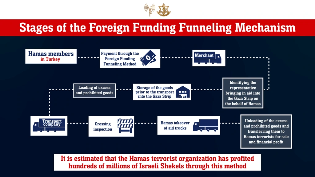 According to IDF assessments, Hamas has received hundreds of millions of shekels in the Gaza Strip from Iran and other funding sources through a funneling mechanism ("Hawala") operated by Hamas members based in Turkey, in coordination with senior Hamas officials in the Gaza Strip. Hamas exploited the humanitarian aid process and international aid organizations, whether knowingly or through manipulation, by pushing for the entry of “excess” aid items, purchased using Hamas’ external funds, into Gaza. Hamas then sold the aid at inflated prices to the residents and collected the cash proceeds.