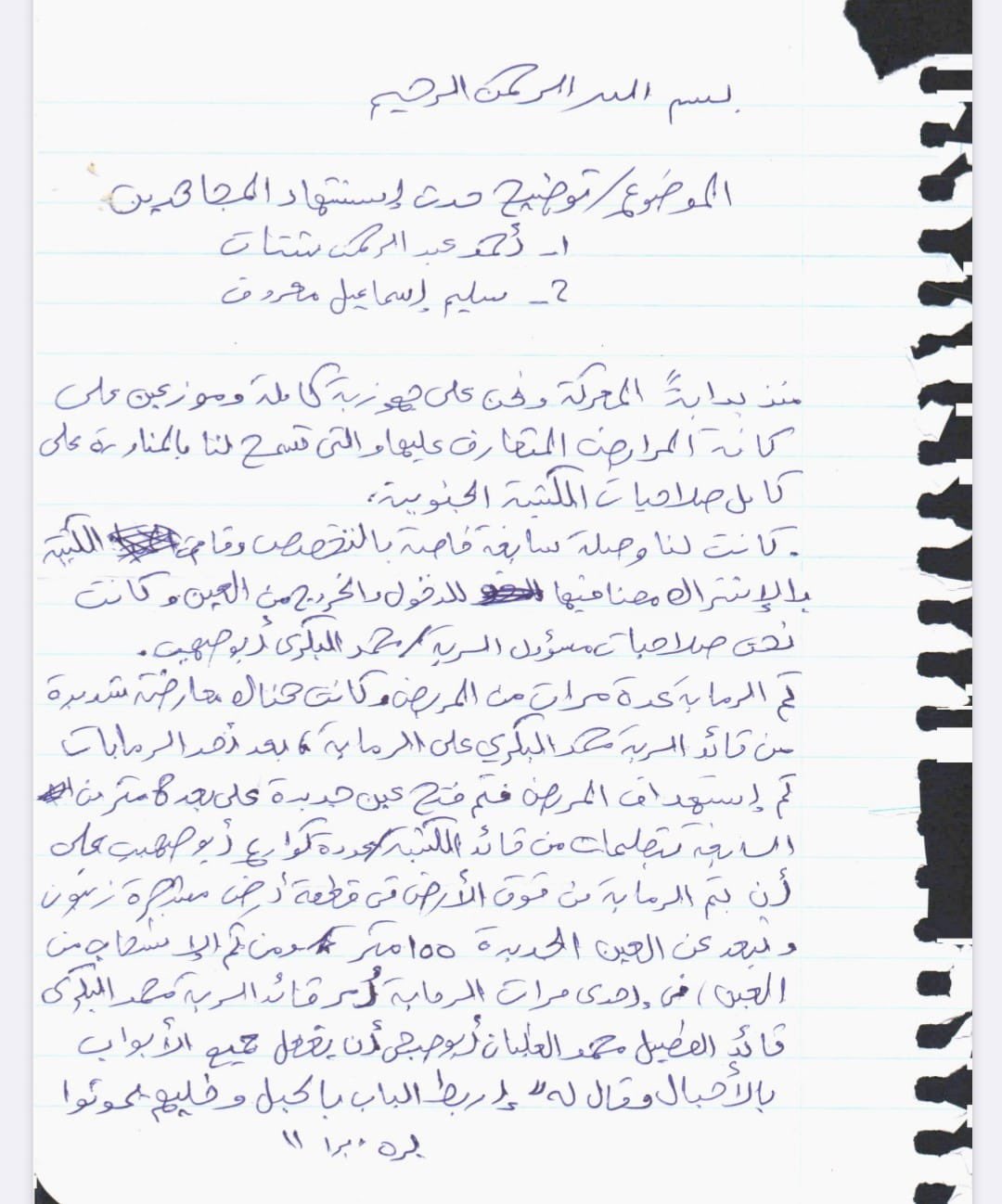 According to the writer of the document, the commander said to his men regarding the fighters: "Close the door with a rope, and let them die outside." The fighters were killed during an attempt to hide in the European Hospital area.