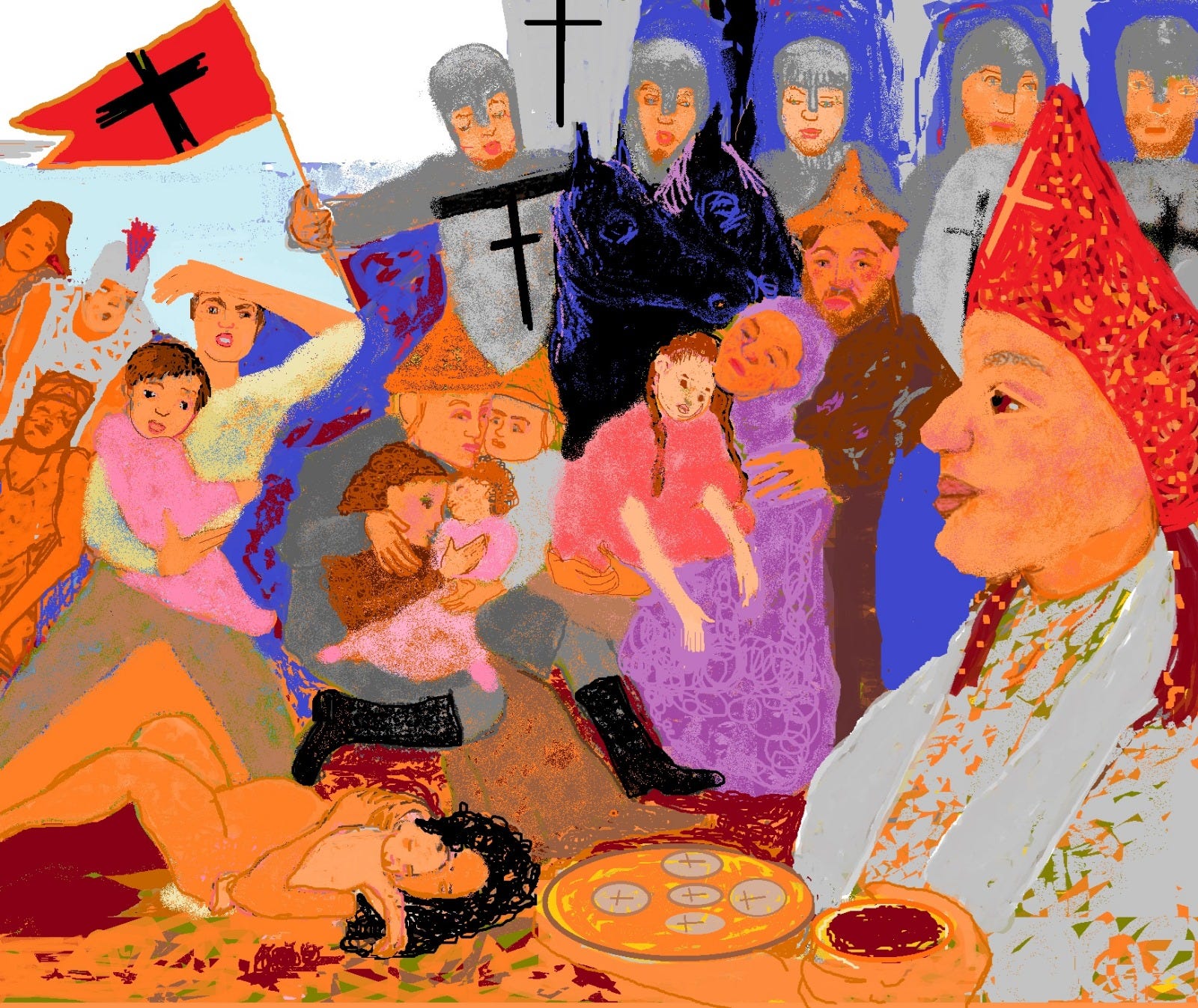 Taken as Slaves by the Romans, and suffering Crusades, Blood Libels—while the Pope "drank the blood" of a Jew. Digital painting, Randy Settenbrino