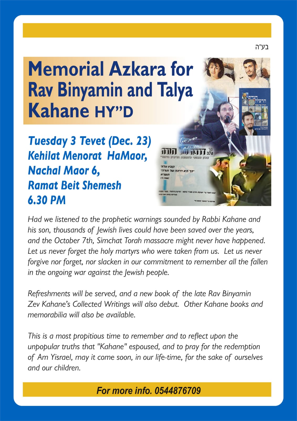 This year marks 25 years since the murder of Binyamin and Talya Kahane. Memorial gatherings will be held next week to honor their memory and to draw strength from their teachings.