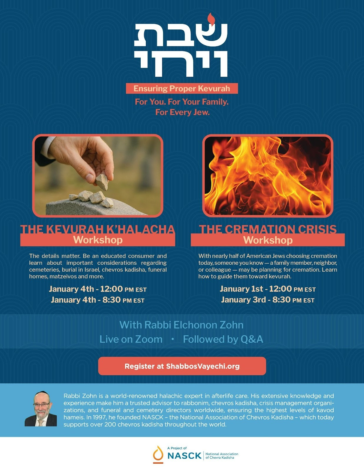 To help the community gain the clarity they need, NASCK is offering two free live workshops over this weekend, presented by Rabbi Elchonon Zohn and followed by audience Q&A. Rabbi Zohn, a highly acclaimed expert in after-life care, is widely respected for his deep knowledge and decades of practical experience advising Rabbis, burial societies, and crisis-response organizations.
