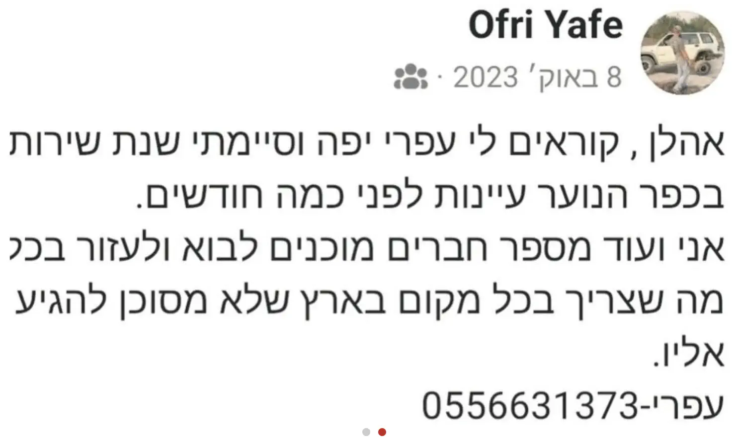 The post was written by Yafe about 3 years ago, when he finished his year of service at the Einot Youth Village.