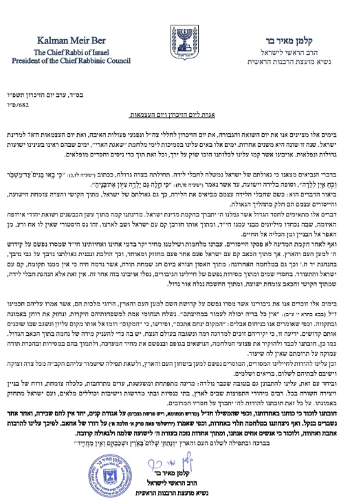 The Chief Rabbi of Israel, Rabbi Kalman Ber, has issued a special letter to the public, addressing the transition between Yom Hazikaron (the Day of Remembrance for the Fallen and Victims of Hostile Actions) and Yom Ha'atzmaut (the 78th Independence Day of the State of Israel.)
