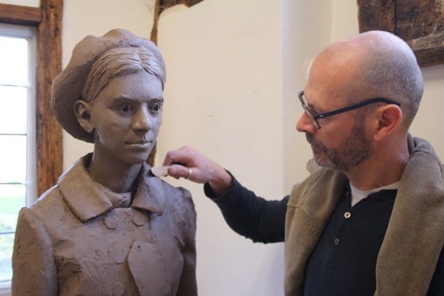 Photo: Artist Ian Wolter with a figure for the Kindertransport Memorial 'Safe Haven' at Rossall school